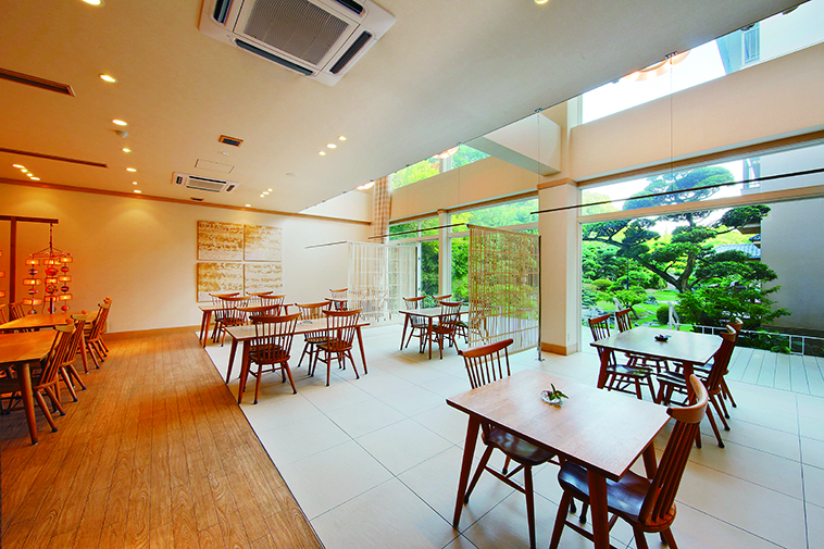 総ガラス張りの明るい空間が広がる食事処「SUZU」。窓の外には緑豊かな日本庭園の眺めも楽しめる。 2024年に客室改装も完了