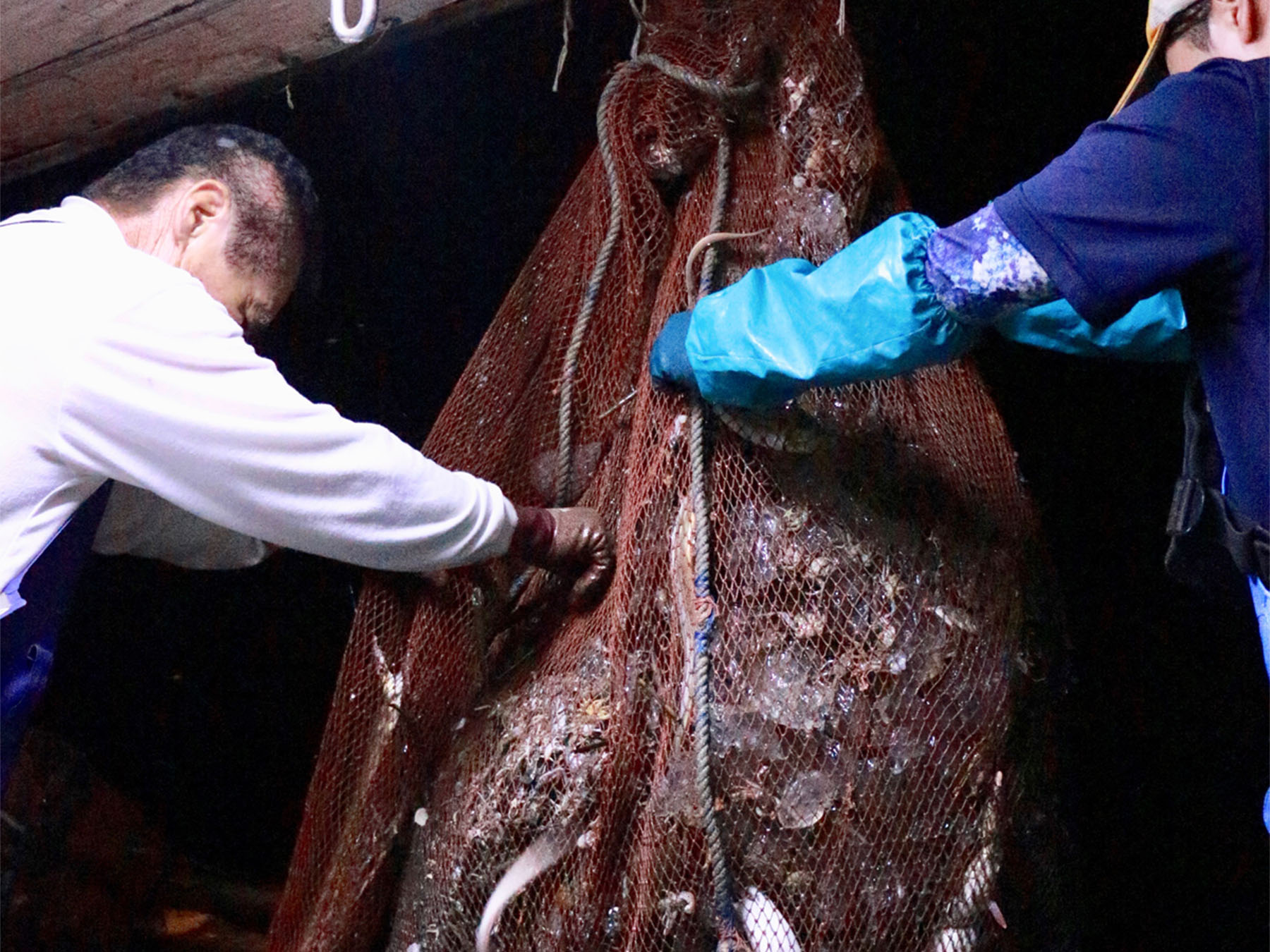 網の中でもハモの白い腹はとてもよく目立つ
