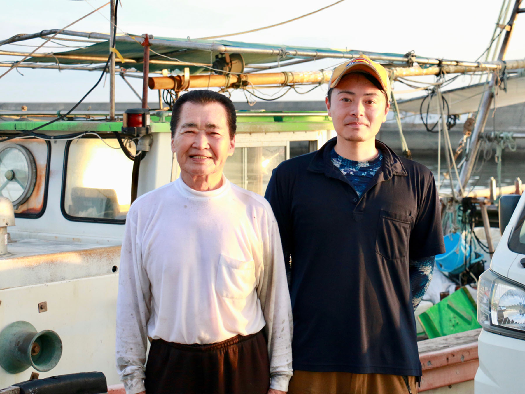 宇島のベテラン漁師・川上喜久雄さん(写真左)と、独立を目指す田中大樹さん