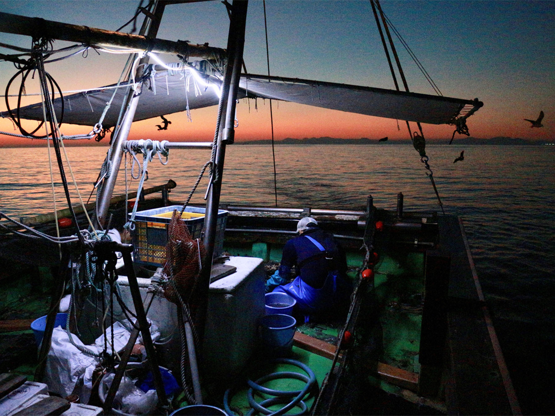 夜明けの美しい風景に包まれ、底びき網漁もいよいよ終盤